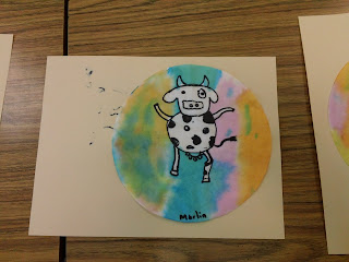 I had third graders sketch out their cows on a coffee filter. They used a sharpie and then colored in the cow with a white crayon. (if they chose to do so).